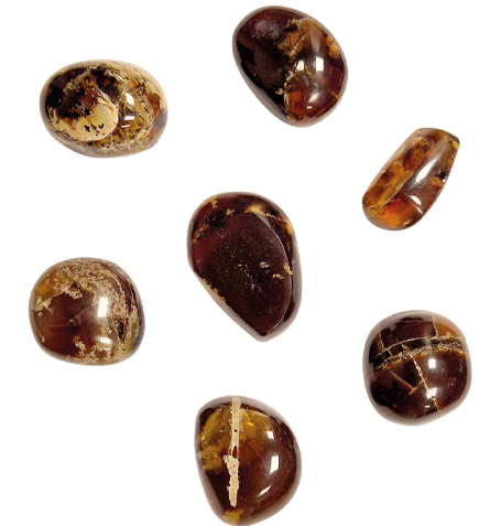 Denna bärnsten kommer från Java och har en mörkare nyans än den europeiska bärnstenen. Bärnsten är ett fossilt harts från forntida barrträd, ca 20- 300 miljoner år gamla. Bärnsten sägs kunna lindra stress, dra ut gifter, och ge skydd och lycka. Storlek ca 20-40 mm.